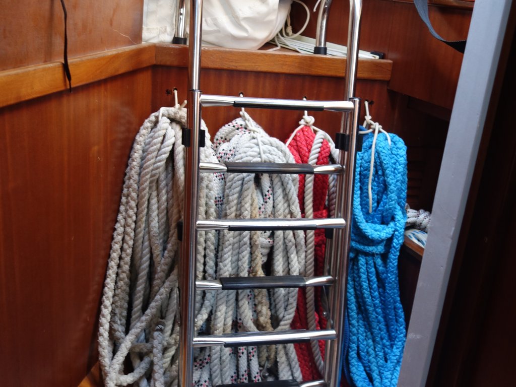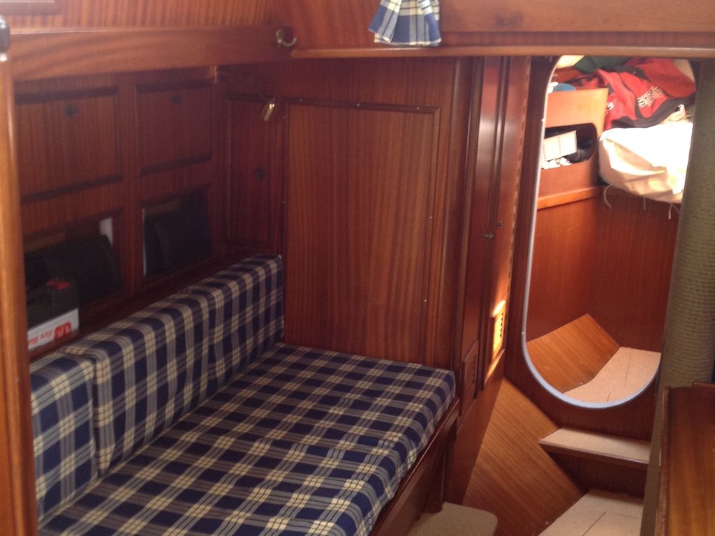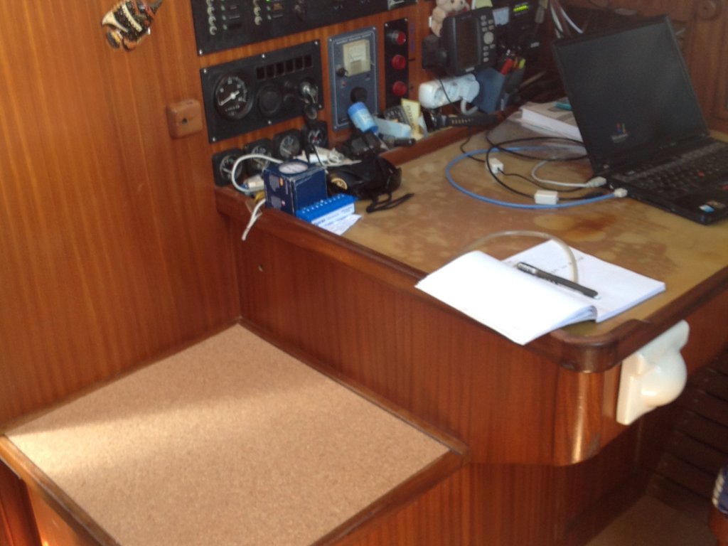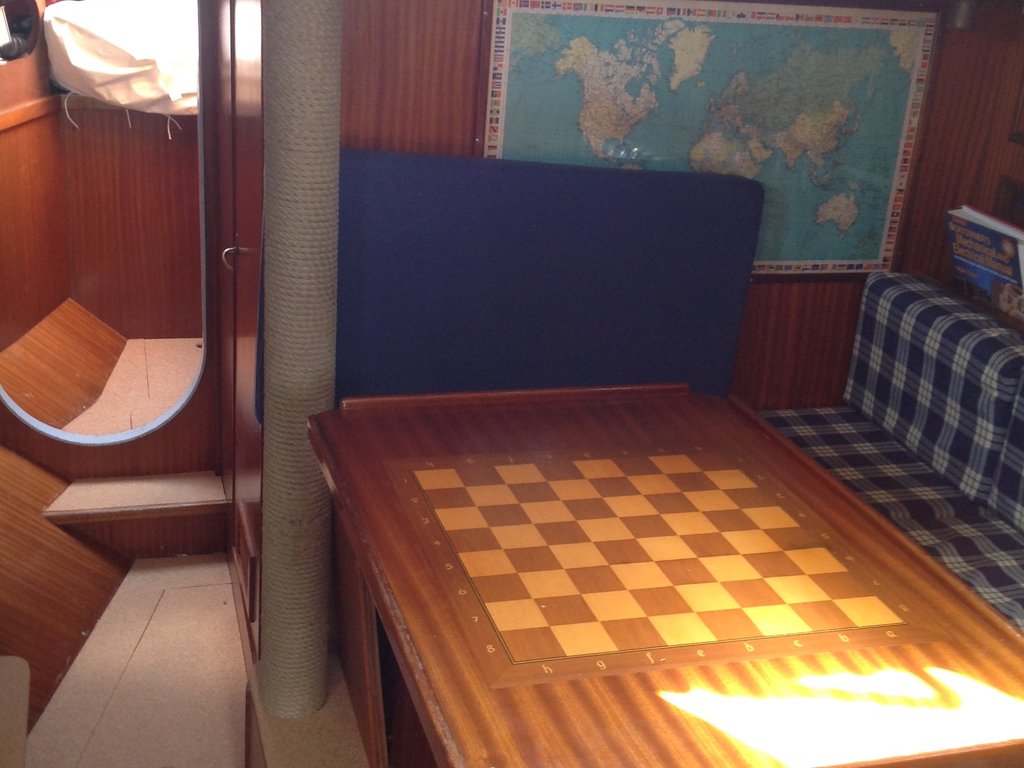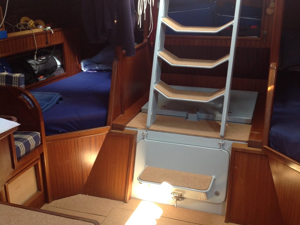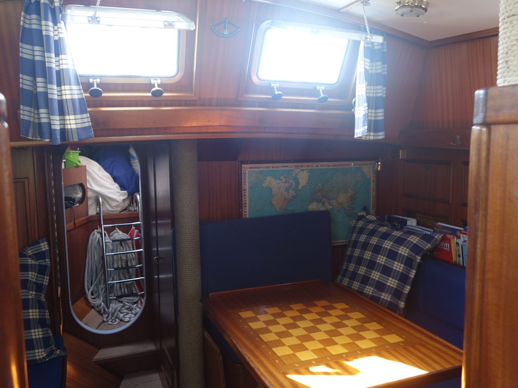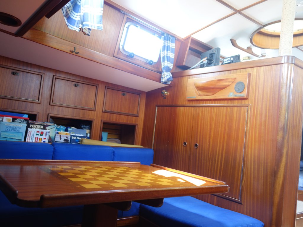 The interior is remarkably quiet even in heavy seas / wind. Classic mahogany wood interior, with emphasis on robustness, durability, and functionality. 1.9m head-room in main accommodation as well as forepeak. Cabin sides lined with mahogany ventilation strips. Robust roof grab-handles and window level grab-rails. All surfaces have robust coamings. Marinized, non-slip cork soles, with easy access to all tanks and bilge below. Large amount of storage in strongly latched cupboards and cubby holes, lockers beneath bunks, etc. Forepeak contains one berth. The remainder is given over to sail, warp and chain storage. ) Companionway with hanging/shelved cupboard (port) and heads (starboard) with hot/cold shower, sink, Lavac toilet, and large storage lockers. Goiot hatch overhead. Comfortable saloon with robust saloon table (with inlaid full-size chess board). Cubby-hole bookcases, and locker cupboards outboard. Saloon seats provide two wide berths, one quickly convertible to comfortable occasional double berth. Royal Blue canvas seat covers (2015). Large central at companionway for galley (port) and navigation area (starboard) with very large (90x80cm) chart-table. A large central tool/equipment box –cover- serves as galley seat and also platform for accessing Goiot observation dome overhead. Two large quarter berths aft, each with storage lockers and shelving outboard.